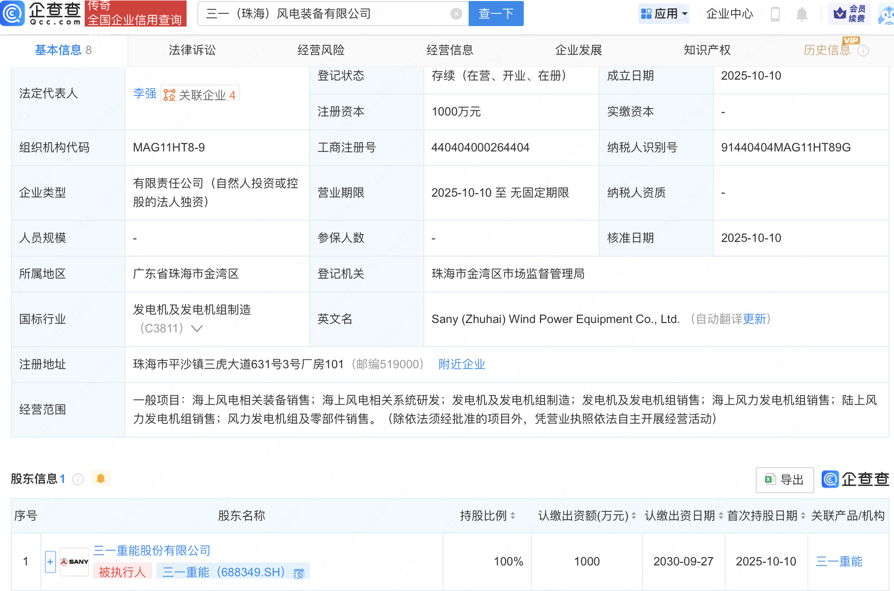 近日,三一(珠海)风电装备有限公司成立,注册资本1000万元线上股票配资网址,经营范围包含:海上风电相关装备销售;海上风电相关系统研发;发电机及发电机组制造等。企查查股权穿透显示,该公司由三一重能(688349)全资持股。